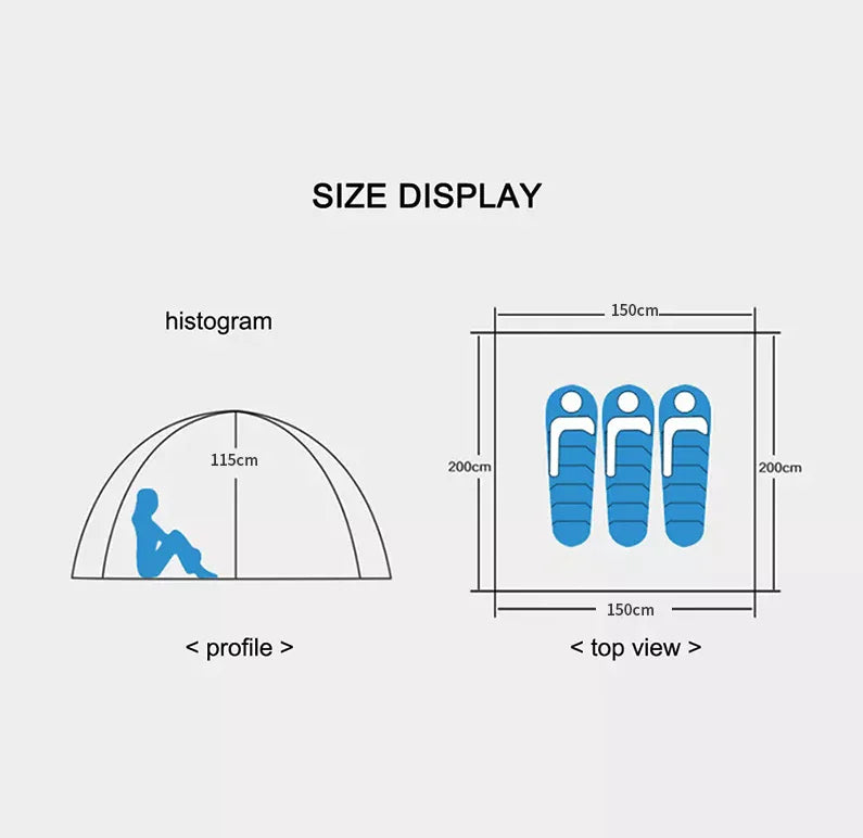 Room The Tent is 200CM Wide x 150CM in length x 115CM Tall. Allowing 2-3 people to comfortable sleep with sleeping bags. Also utilize this tent to sleep 3-4 kids or 2-3 adults.